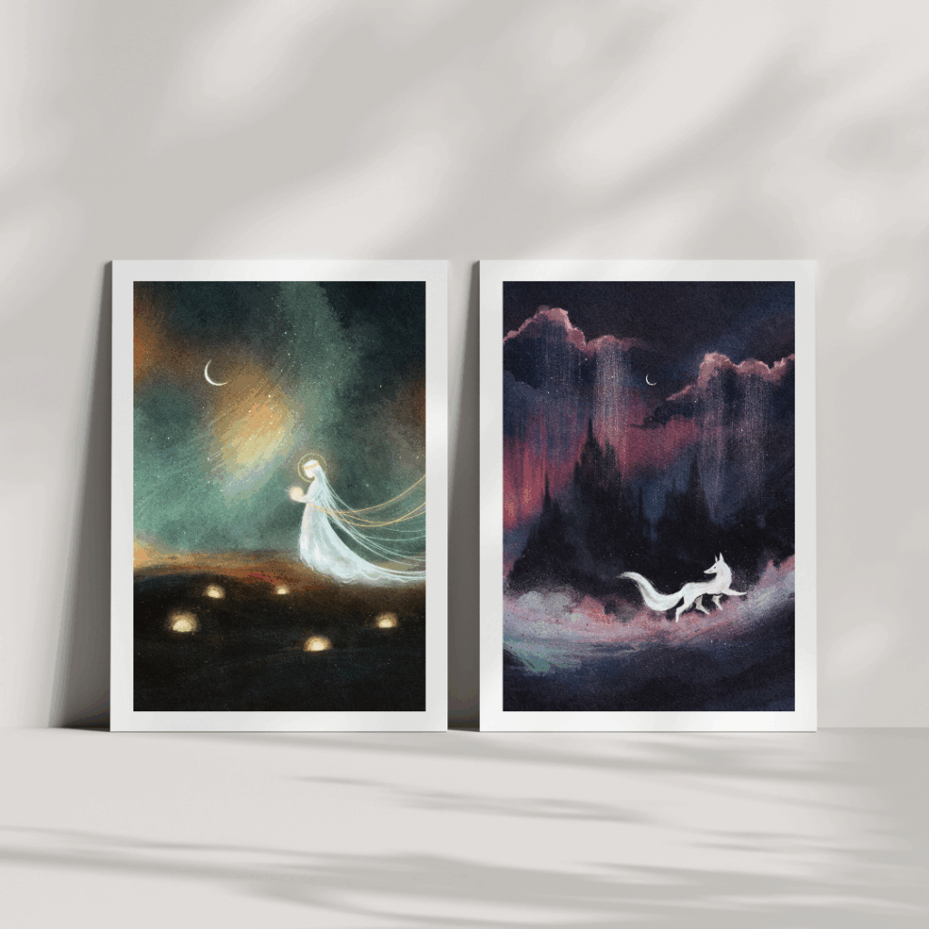 Made in digital with Procreate, these paintings are inviting one on a journey to a whimsical kingdom, where mystical creatures reign in a dramatic scenery.